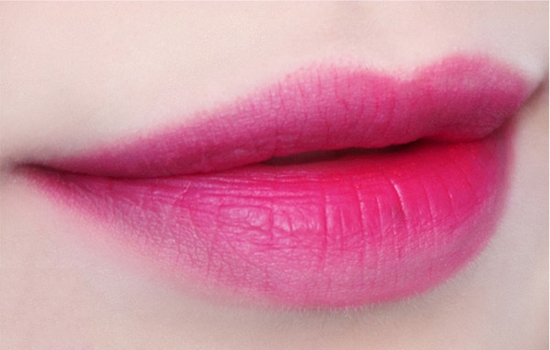 步骤五:唇部先用遮瑕产品打底,然后涂抹淡淡的粉色唇膏,模糊唇线边缘。在唇中用桃红色的唇膏重点晕染,让唇部看上去更加娇艳。