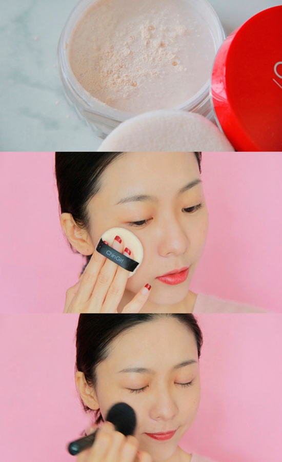一般在阴影和腮红后用散粉,博主用的是一款国货蜜粉,菁蔻丝柔定妆蜜粉。菁蔻大家可能不太熟悉,这是一个很好用的国货品牌!这款定妆蜜粉很适合油性皮肤,它质地非常轻薄,米粉色的,可以很好地柔滑皮肤,能把油光、泛红啊通通扫光。用它定妆后,皮肤滑滑的,控油力也持久,脸上不会有那种粘腻的感觉,清爽极了。