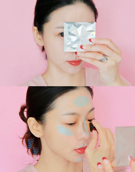 在定妆蜜粉后用高光粉提亮,这样可以能跟好的用高光粉的细腻珠光打造完美肤质。高光粉打造的区域已经标示出来了,用的是CPB当年大火的高光。