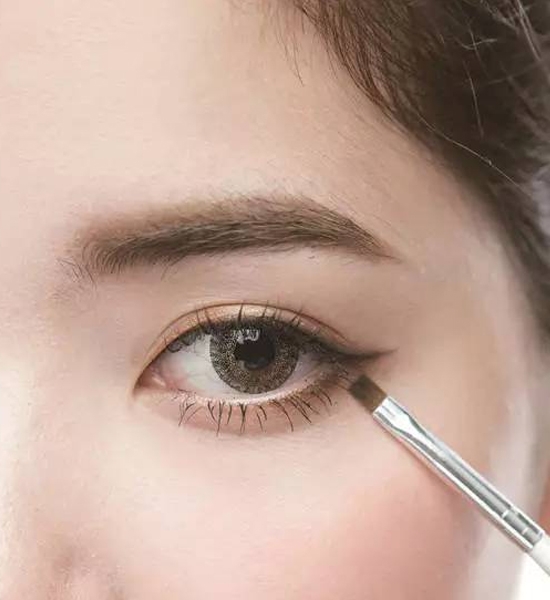 2.以金棕色眼影涂抹於眼摺,再用较深的棕色加强眼尾1/3处阴影。