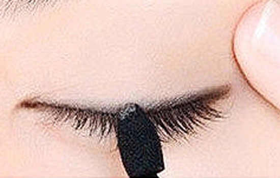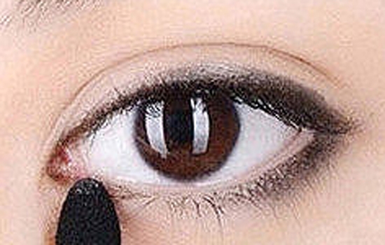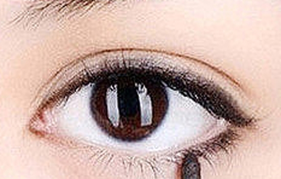 眼线刷蘸取少量的眼线膏,从眼尾至眼头的方向,在下眼睑的眼尾1/3处画下眼线,将上下眼线连接起来的效果,注意要从眼尾至眼尾至眼头的方向慢慢减淡眼妆颜色。
