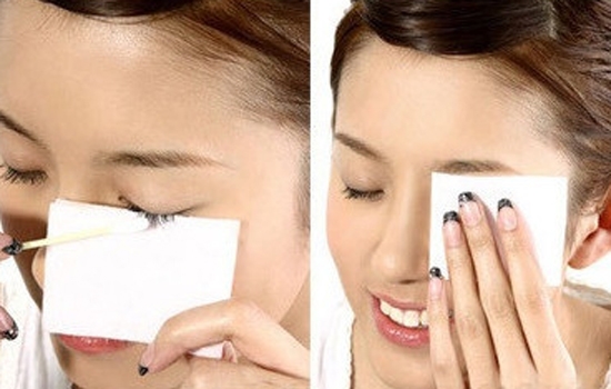 2.将准备的纸巾对折放在上睫毛下面,闭上眼,再将棉花棒沾满卸妆液,卸除方向是由下向上,就是由睫毛根部向下抹去。然后张开眼睛,将纸巾放在下眼睫毛底部,然后用棉花棒也是由睫毛根部向下抹。