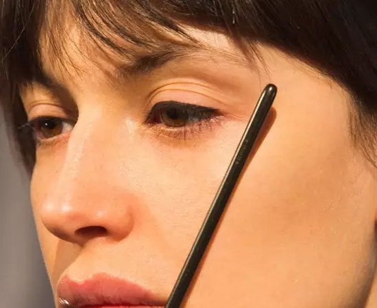 拿一根长笔刷以嘴角为起点,斜向上方呈一条斜线,在眼尾平行的位置,与笔杆交汇的点,就是比量出的下一步最佳描画区域。