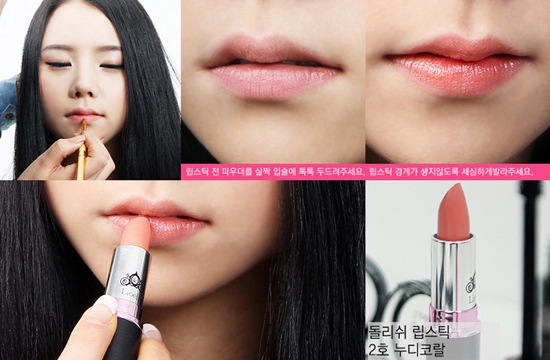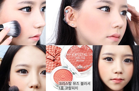 粉色腮红,整个妆容都完成后,在脸上画上珊瑚红色的口红,整个甜蜜的妆容,到此就结束了。
