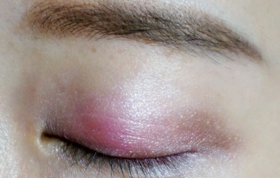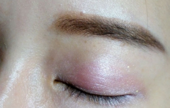 步骤七:在眼球最凸处,用手指沾取爱茉莉眼影膏涂抹并晕染开来。向两头用粉色涂在眼尾处进行深浅渐变。