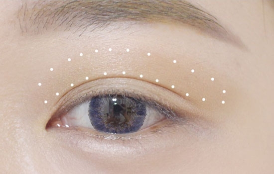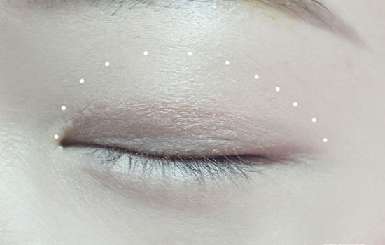 在底妆和眉妆后,沾取浅色眼影在眼皮大面积铺满,提亮眼部。