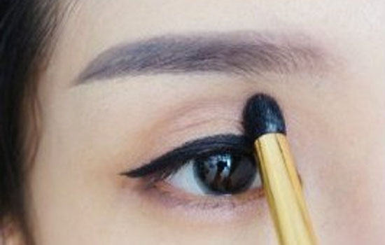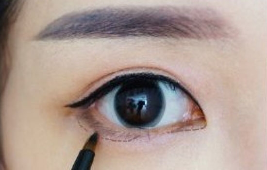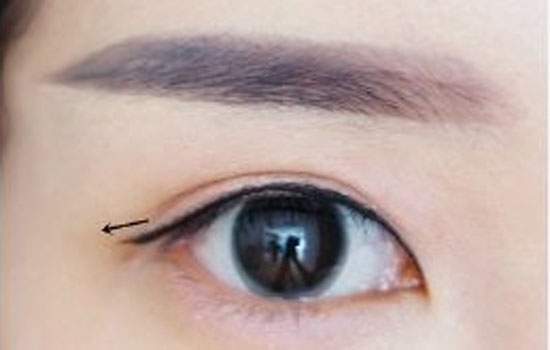 5.用眼线膏画出眼线外形,眼尾稍稍拉长,并填满睫毛根部内外眼线。