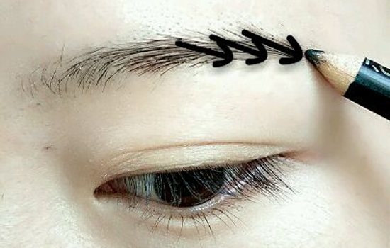 步骤一:上完底妆后,用眉笔轻轻地按照图中标记的方向一根一根的化,要一笔到底,化眉毛的后半部分。相比于眉粉,这样化出来的眉形根根分明,更加自然