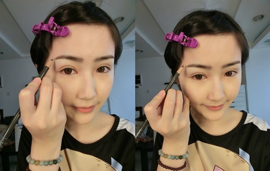 步骤二:用灰色眉笔先画眉尾,勾勒眉毛形状,再用三色眉粉中的中间色填充眉中,眉头处注意晕染。