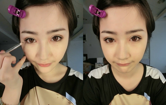 步骤四:Baby的眼影部分不是重点哈,画上基础的大地色眼影就可以了哈。Baby的睫毛非常浓密,选择浓密型的假睫毛和粗粗的眼线来打造眼型的部分。