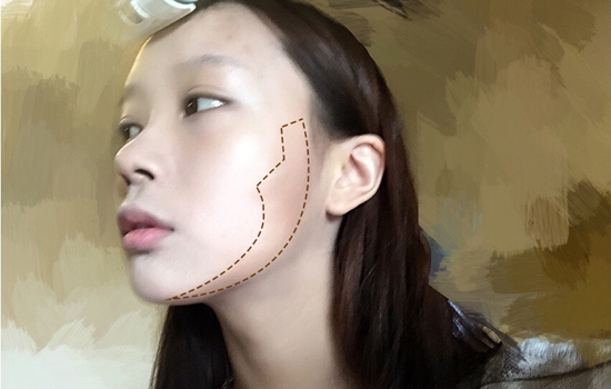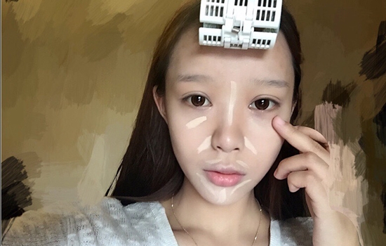 步骤四:用小的粉底刷沾取深色粉底液涂在阴影部分,向外自然晕染开。