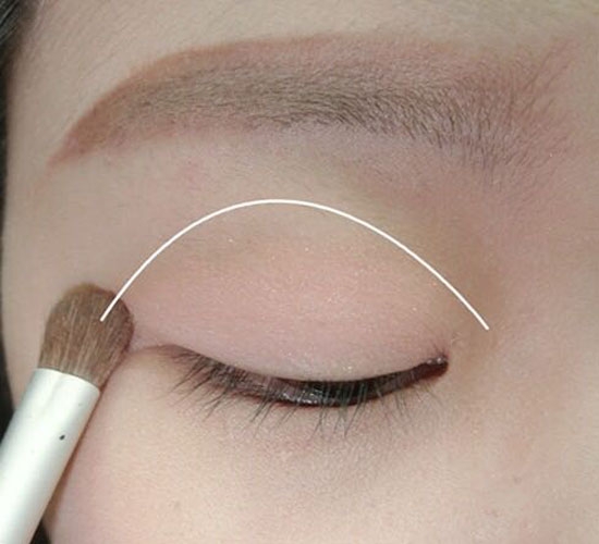 将珠光色眼影大面积涂抹在上眼睑处,少量多次,反复涂抹到两次到三次。