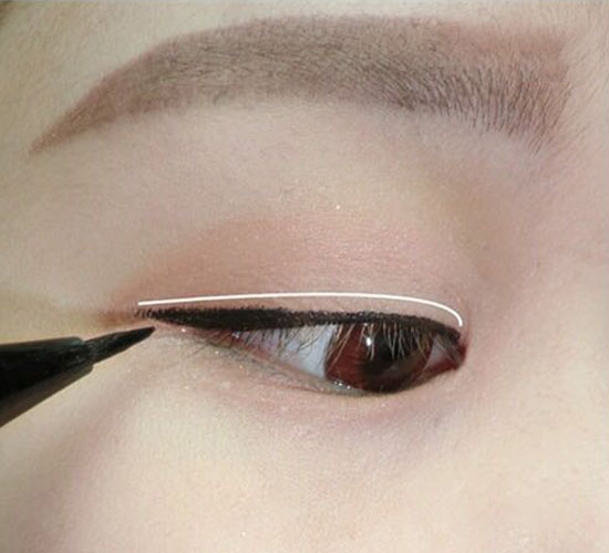 用眼线液仔细的将睫毛根填满,然后将眼睛半闭,按照图中白线画出一条外眼线,眼尾延长4mm。