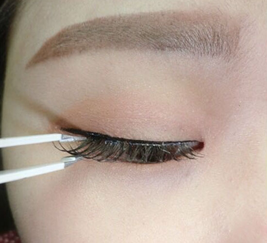 在上睫毛出粘贴自然型假睫毛,想要更自然效果的可以只粘眼尾部分。