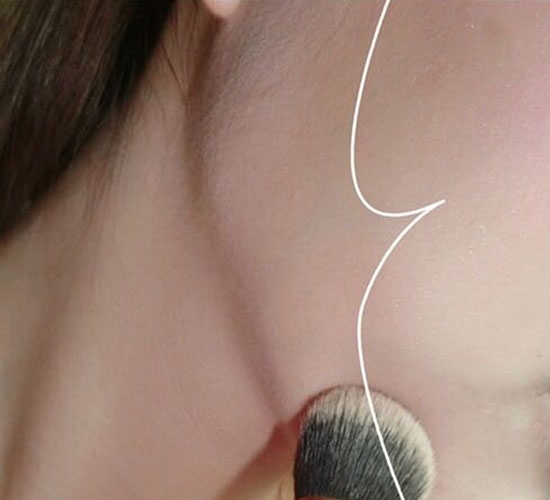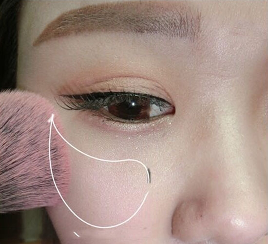 将腮红以打圈的形式大面积涂抹,不超过眼球内侧及鼻翼以下。