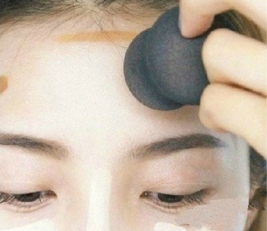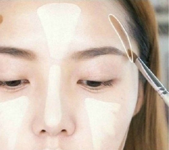 在额头两边与上方发际线等3处刷上暗色修容,在额头两边修容,会使得额头看起来变窄,突显在刚刚打亮的地方(参考第一步),并呈现光滑明亮的感觉。