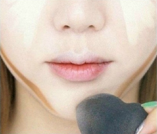 画在下巴的亮色修容(参考第三步)一样轻轻拍匀,注意不要喝修容的线条混在一起。
