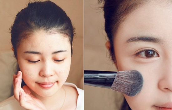 底妆选择轻薄自然,符合自己肤色的粉底液,将其均匀点在脸部,再用轻轻拍打的方式把粉底液推开。如果有痘印、斑点等需要遮瑕的位置,就在瑕疵部位多点一点粉底液遮盖就然后再用大号的刷子轻刷一层粉饼或者粉进行定妆。