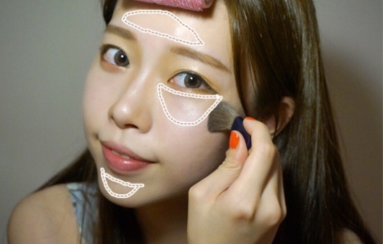 在图中标注的位置刷上高光提亮,位置也可以视自己情况而定哈。在苹果肌上刷上浅粉色和橘色混合腮红即可。