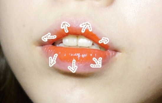 唇部做好保湿工作后,用遮瑕液遮掉唇线。将橘色唇釉均匀涂在唇中,用手指轻轻向外涂开。