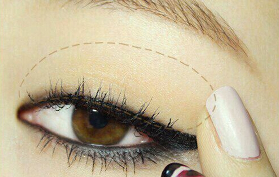 1.浅棕色的眼影均匀涂抹整个上眼皮(棕色虚线内)