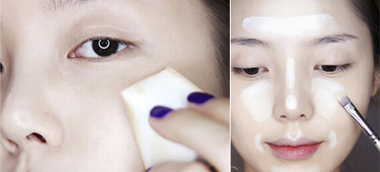 步骤二:粉底液可以让脸上肤色更均匀,想让妆容通出苹果一样的诱人光泽,可以将高光涂抹在图示的位置,然后再一次涂抹均匀,最后,刷上蜜粉定妆就OK了!