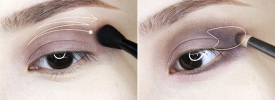 步骤五:只有用稍微大的感觉的眼影刷,如图中白线所示的方式,将眼影晕染开,让妆效更加自然。用扁形眼影刷蘸取深褐色的眼影涂抹在眼脸白色区域内,可以瞬间将眼睛放大。