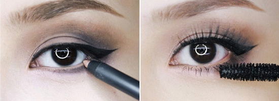 步骤七:用眼线膏画出眼尾上扬的眼线,一定要记得描绘出内眼线,不然中间留白会很丑的,用褐色的眼线笔描绘出下眼睑的内眼线。