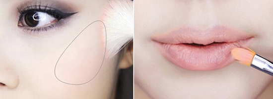 步骤九:在上图示范的位置刷上腮红,再脸颊两边轻轻刷上一层阴影粉,好气色和小颜效果就能轻松拥有。