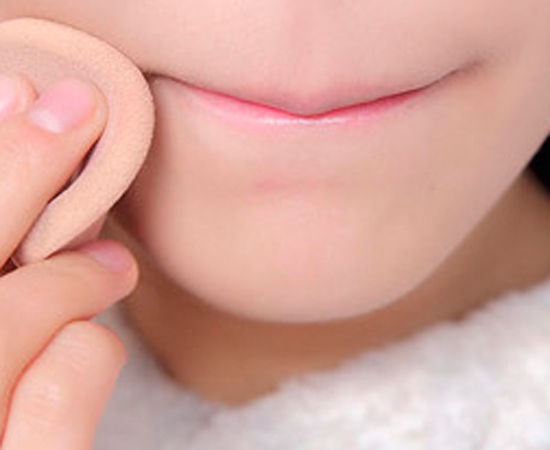 将嘴半抿,以粉扑轻轻在唇部按压几下