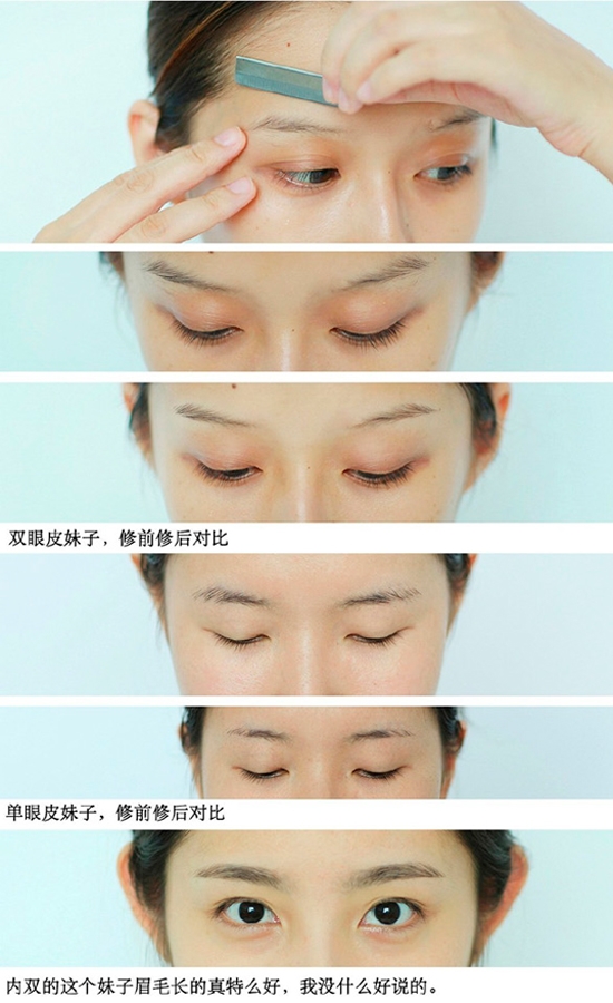 单眼皮妹子:眉尾处长度过长,需要剪掉一些,把眉峰的位置压一下。