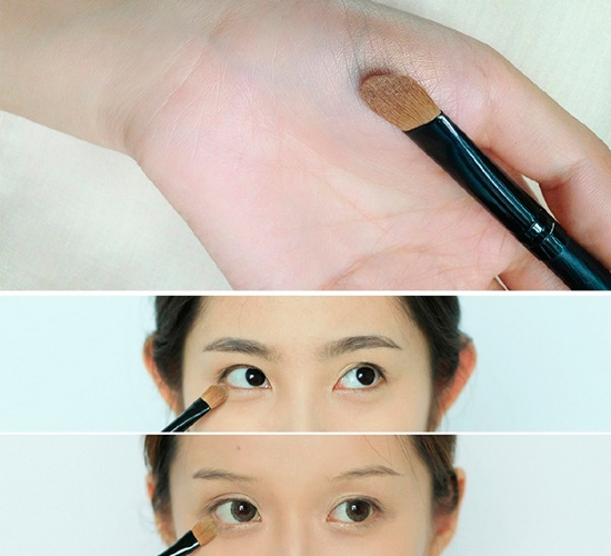 建议用宽一点的眼影刷,从眼尾往眼头过度,再从眼头往眼尾过度。如图的程度即可。