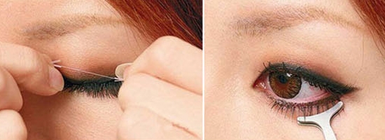 步骤六:在戴上假睫毛,下睫毛贴的离开眼线少少,之后用黑色眼影填满中间的空隙。