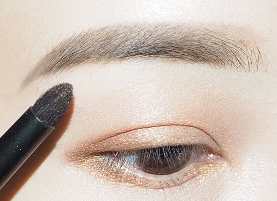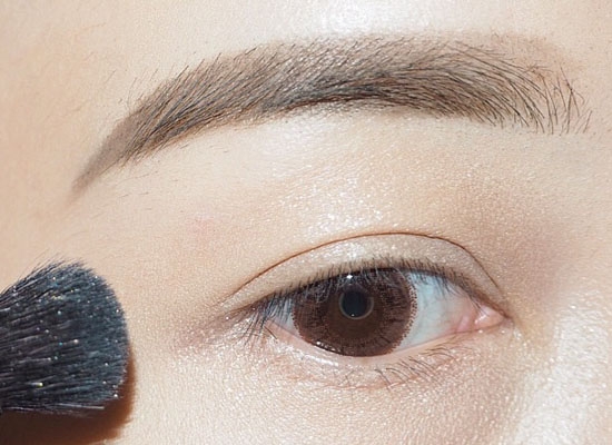 锥形刷取棕色画双眼皮褶子和下眼线,注意晕染到位。