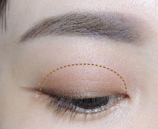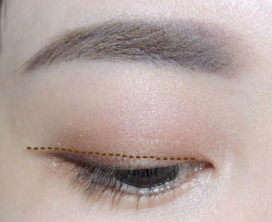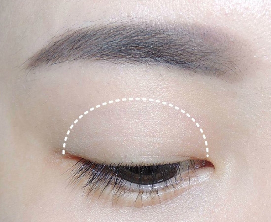 用米黄色眼影大范围涂抹在上眼皮,为眼皮打底。