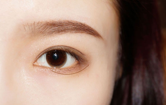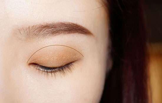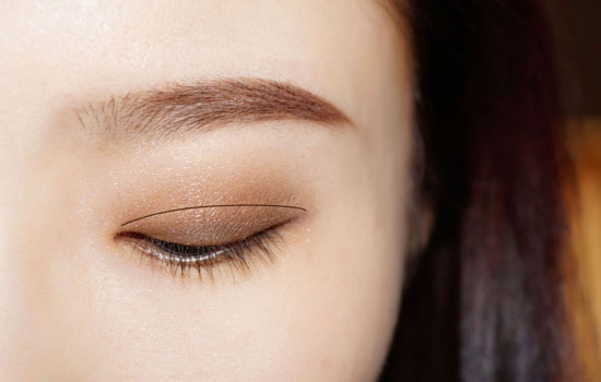 第四步:小号眼影刷沾取深棕色从睫毛根部开始刷在眼皮上,范围略微超过双眼皮褶皱。之后用晕染刷将整体眼妆晕染一下,再沾取珠光色晕染眼影边缘。