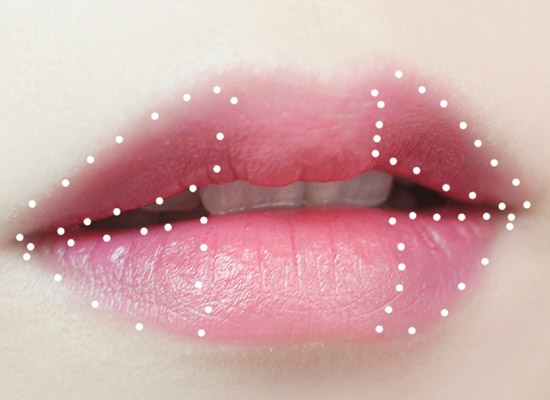 先用粉色唇膏打底,再用深一些的唇膏用唇刷加深双唇两侧。