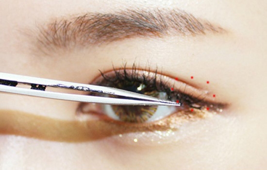 第八步:贴假睫毛时,只贴眼尾就可以。整体调节假睫毛和眼角睫毛的位置和贴合度。