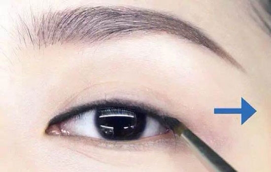 同步骤三,在眼尾平坦的状态下描绘眼尾。这是适合所有彩妆的基本眼线,从眼尾处自然向后拉长约 3~5mm 即可。