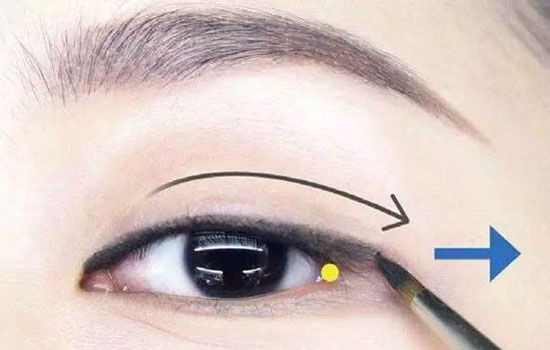 用另一边手指轻轻地拉,使眼尾平坦。之后以手指稍微定住往脸外侧拉即可(蓝色箭头方向)。现在用 A 顺着睫毛根以画 Z 字