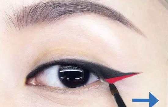 虽然可以在上一步就结束,但不妨把复古风情极大化!在刚刚拉长的眼尾下方再描绘一下,即图中红线标示的部分,只要笔直地画,呈现有角度的样子即可,让眼线像在眼尾处被截断的感觉。