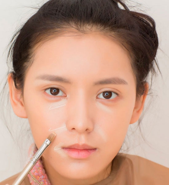 四个必要重点提亮和遮瑕的部位,打上高光并和底妆压匀能够让面部平坦圆润,让眼沟鼻沟不显著。