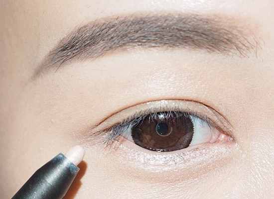 第八步:用卧蚕笔画卧蚕,画在下眼睑前三分之二处,画好以后用另一头海绵晕开。