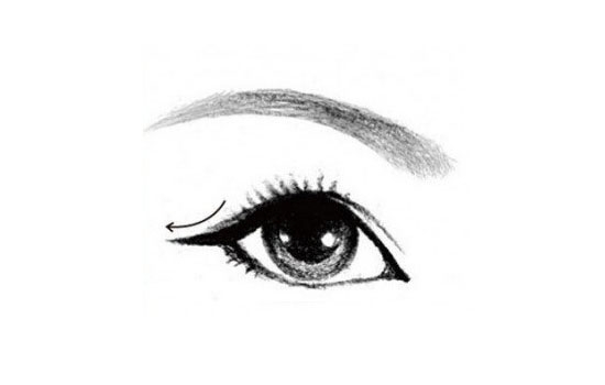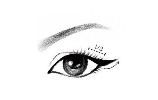 画法技巧:如果你想为这种眼形画一个全包围式的眼线。一定记得在内眼角的部位画细一些,从眼睛外侧1/3处开始,可以画得略粗一些。外眼角的部位,可以朝着太阳穴的方向向上挑起,与太阳穴距离越宽,可以把眼线画得越长些。