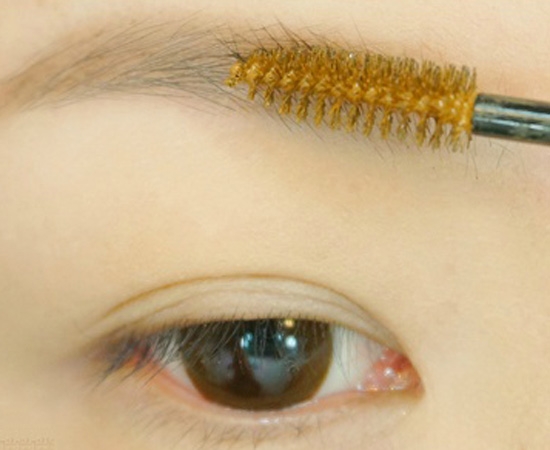 为了让眉毛的线条更柔和自然,用一把比较硬的刷子把眉毛上缘的边框晕染开,然后涂上与眉色相近的染眉膏。