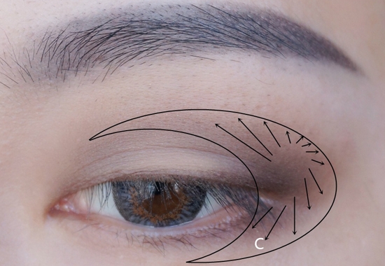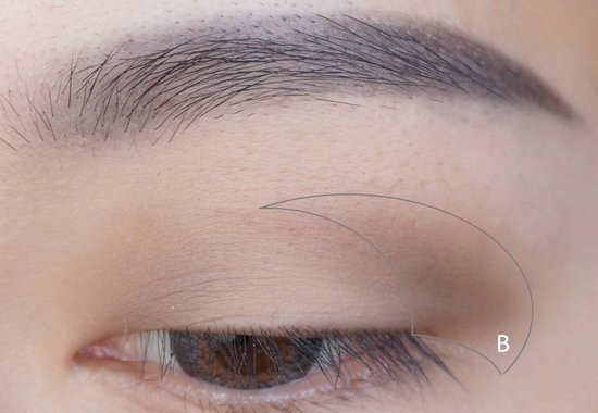 用一把精细的小刷子沾取深一色的眉粉,沿着眼窝线画出一个三角形的眼窝,并且晕染开,要反复多次添加晕染,且注意眼皮的中央一定要留白。