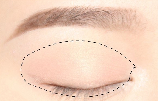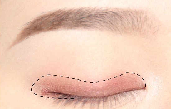 第六步:深色画双眼皮褶皱内,从睫毛根部画起往上晕染,余粉带到下眼睑后三分之一。