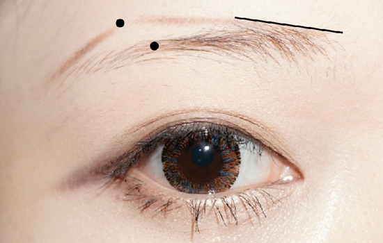 用眉笔做好五个定点,眉头斜上上、眉头弧度的点定在眉峰右下方、眉峰位置定点在眼仁和眼尾的三分之一处,在定点的基础上,眉尾到时候要稍微延长一点。