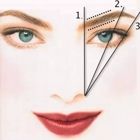 眉毛的比例大约构成三角形般,分别是1眉头、2眉峰及3眉尾。先利用眉笔(沿着图中直线)量度出恰当的定位。
