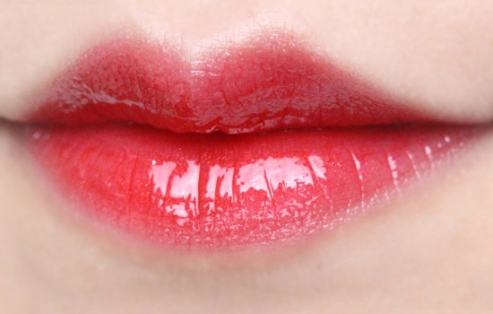 最后,薄薄的涂上水红色唇釉。